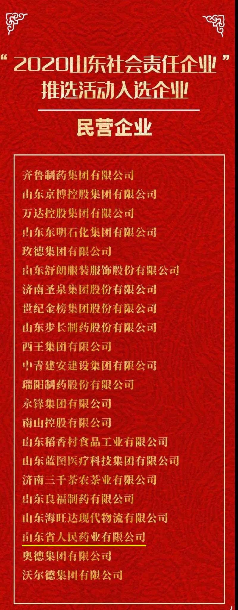 “2020山東社會責任企業(yè)”推選活動終評會12月23日在濟南召開。經(jīng)過與會評審專家兩個多小時的評議和投票,山東省人民藥業(yè)有限公司躋身“2020山東社會責任企業(yè)”榜單。