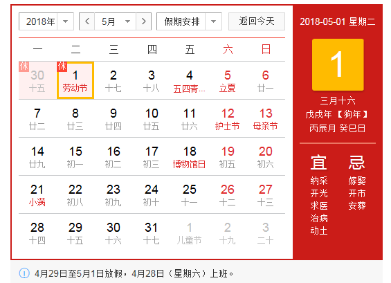 法定節(jié)假日,5月2日(星期六)、5月3日(星期日)為公休日,5月4日(星期一)上班。